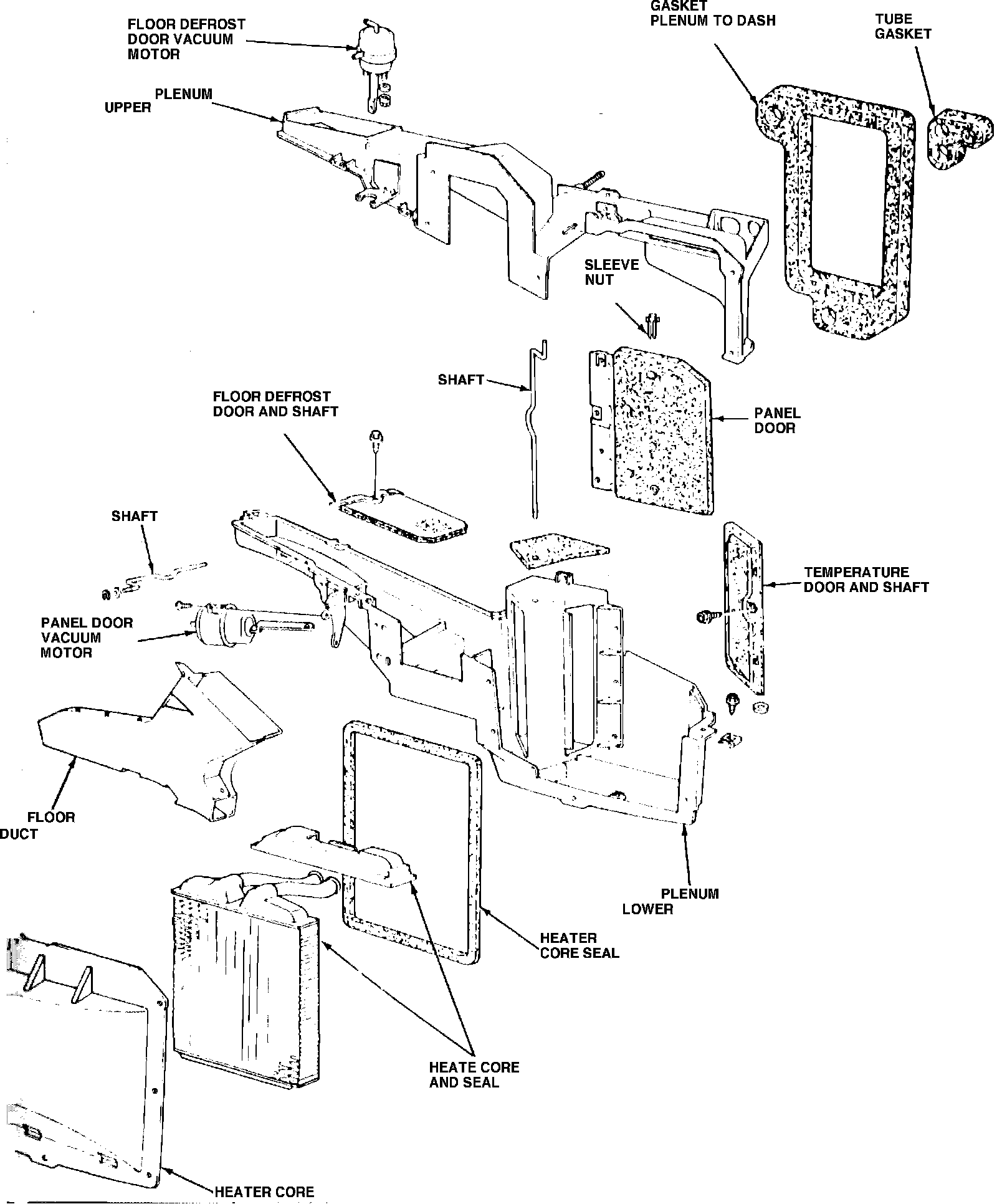 5. Working under instrument panel, remove 2 nuts on 1980---81 models, or 3 nuts on 1982---87 models, attaching left side of heater assembly and right side of plenum to dash.