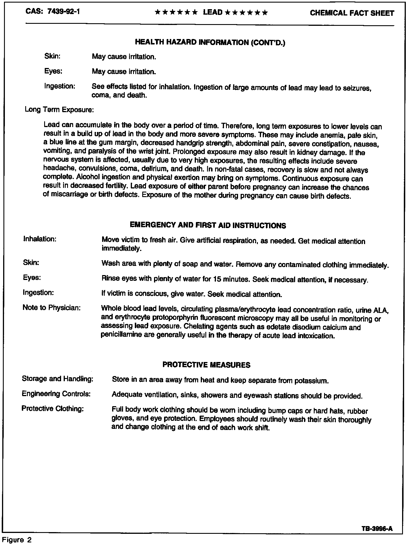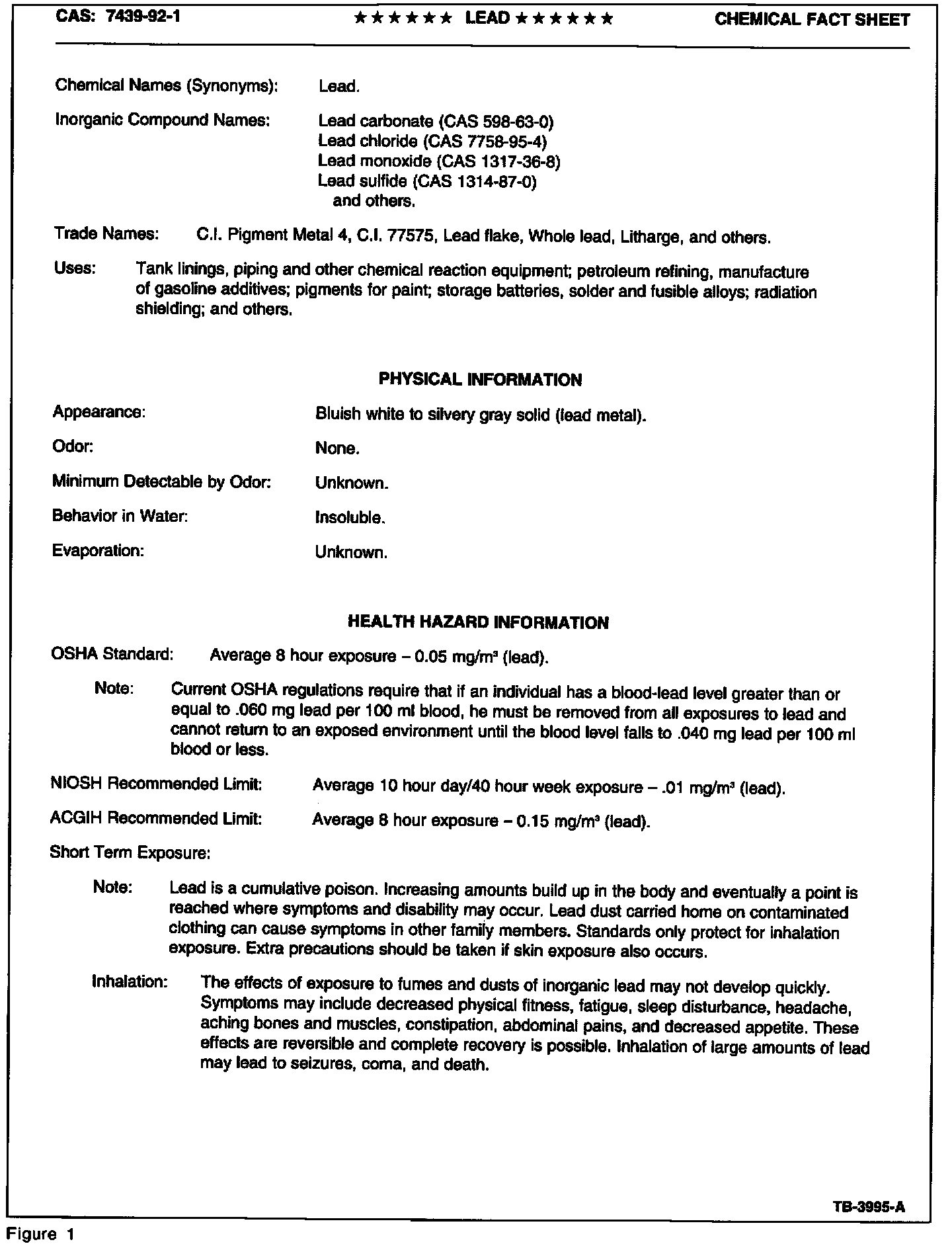 LEAD CONTAMINATION POTENTIAL: THE ELECTRODEPOSITION PRIMER USED BY FORD MOTOR COMPANY OVER BASE METAL ON SERVICE REPLACEMENT PARTS OR COMPLETED VEHICLES CONTAINS SMALL AMOUNTS OF LEAD FOR CORROSION PROTECTION OF STEEL. EXCESSIVE DUSTS GENERATED BY UNNECESSARY AND IMPROPER SANDING MAY CONTAIN AIRBORNE LEAD CONTAMINATION IN EXCESS OF OSHA STANDARDS. INFORMATION REGARDING THE HAZARDS OF LEAD CAN BE FOUND IN THE CHEMICAL FACT SHEETS IN THE FIGURES IN THIS ARTICLE.