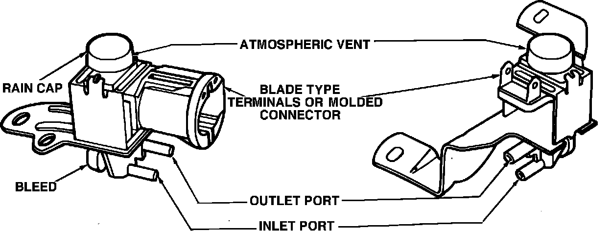 There are three types of solenoid vacuum valve assemblies, Figs. 24, 25 and 26. The normally closed solenoid vacuum valve assembly incorporates two vacuum ports and an atmospheric vent. When the solenoid is de-energized, the vacuum valve assembly outlet port is open to the atmospheric vent and closed to the inlet port. When the solenoid is energized, outlet port is open to the inlet port and closed to the atmospheric vent. Some normally closed solenoid vacuum valves also incorporate a control bleed to prevent contamination from the solenoid vacuum valve from entering the intake manifold. This solenoid valve assembly can be used in the exhaust heat control valve , throttle kicker, air dump or air diverter valve systems.