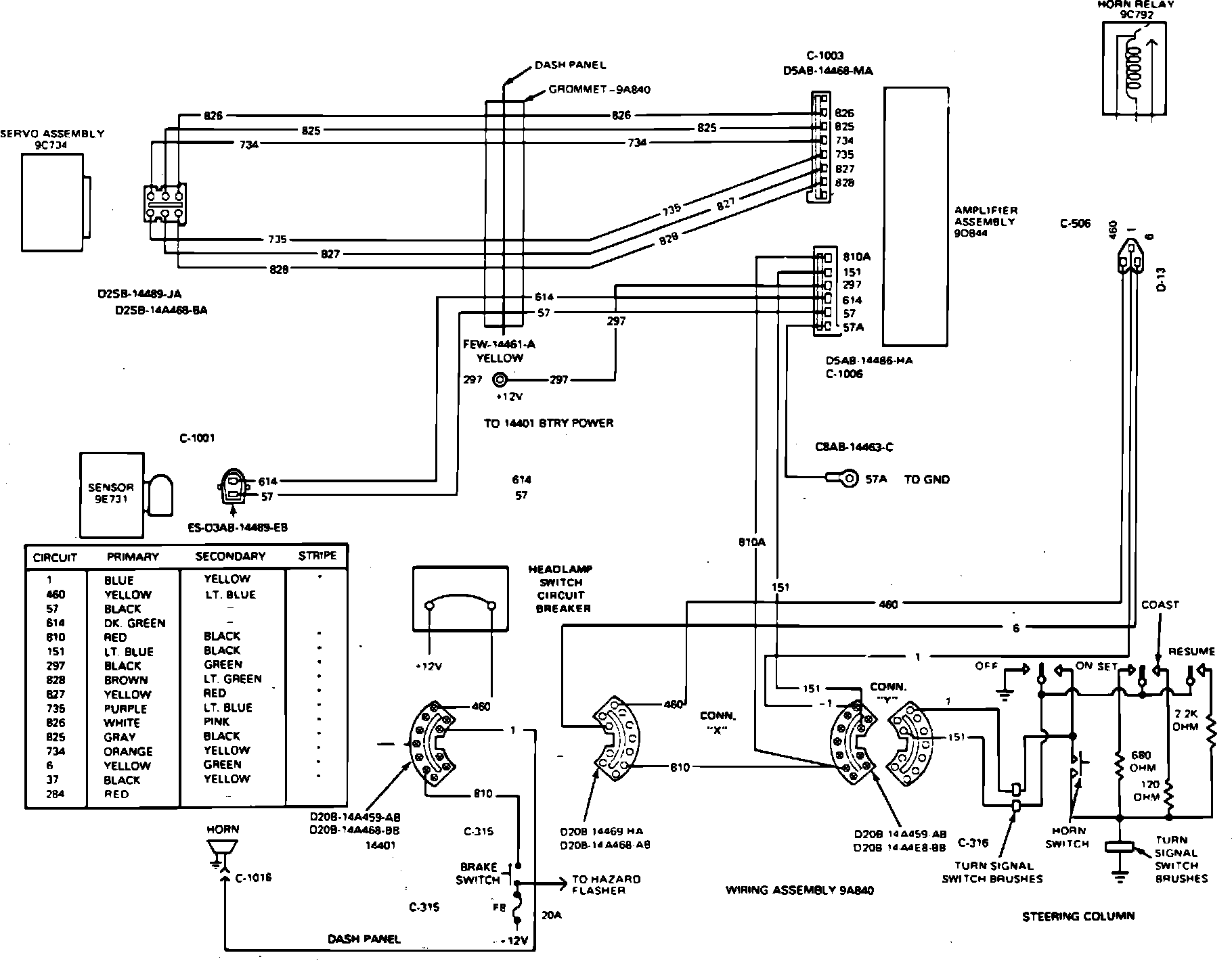 4. Check horn relay by momentarily grounding circuit 1 to chassis. This bypasses horn switch and horn should sound. If horn does not sound, check for battery voltage at connector X wire 6 during relay operation. If voltage is present at circuit 6 during relay operation, an open circuit is indicated between horn and connector X.