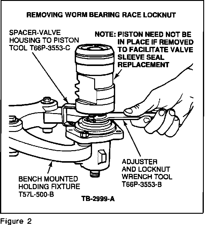 8. Using Adjuster and Locknut Wrench Tool T66P-3553-B, remove the worm bearing locknut, Figure 2.