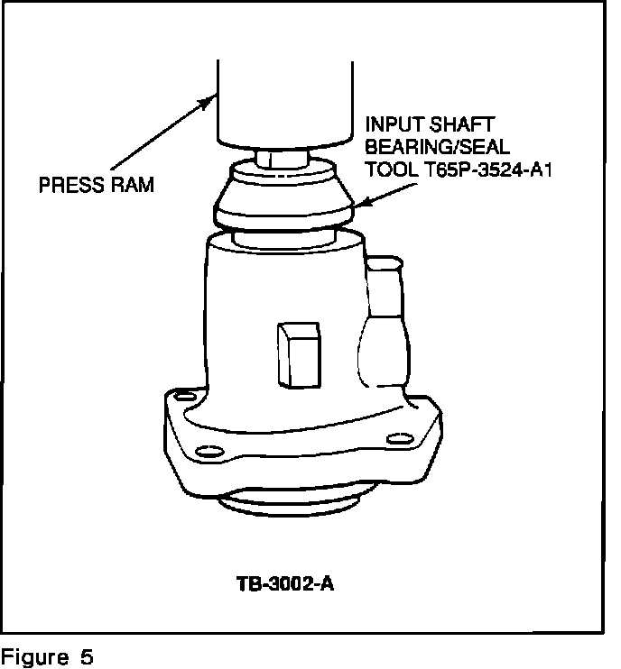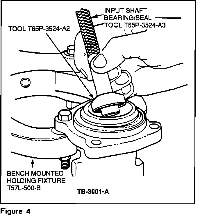 14. Insert the Input Shaft Bearing/Seal Tool T65P-3524-A2 and T65P-3524-A3 into the valve body assembly opposite the oil seal end. Gently tap the bearing and the pressure seal out of the housing, Figure 4.