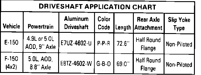 ACTION: To correct this, install a new onepiece aluminum driveshaft using the following service procedure. Refer to the driveshaft application chart on this page for the correct service part.