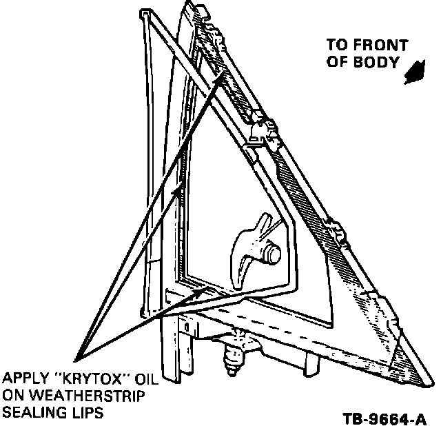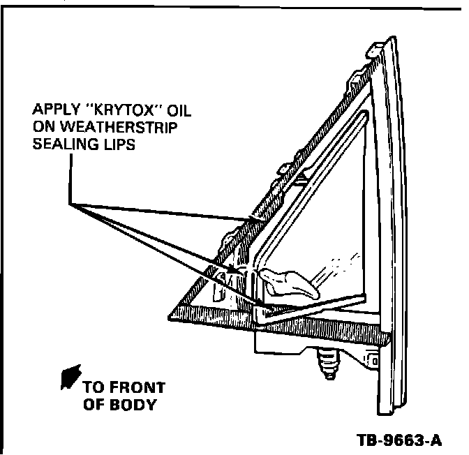 2. From inside of vehicle, apply "Krytox" oil on the weatherstrip sealing lips of vent window, Figure 1.