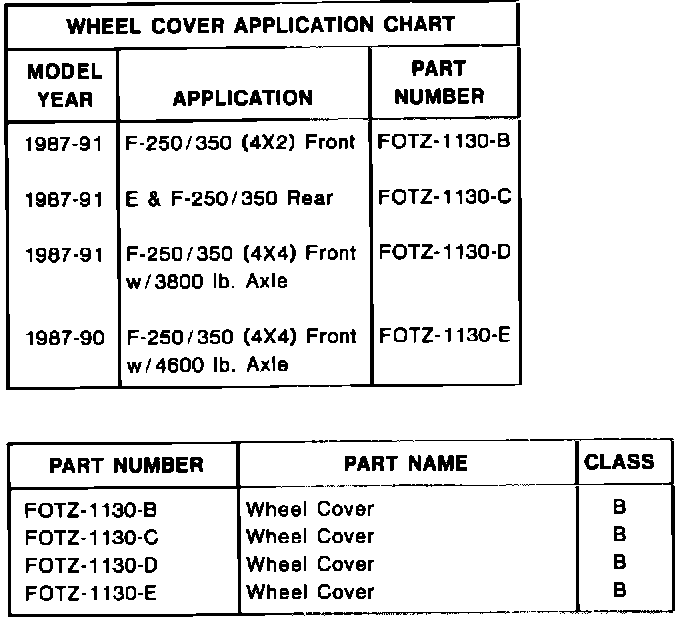 ACTION: Install new wheel covers made of a more durable plastic. The color of the new plastic material is gray which will help hide any stone chips. Refer to the following Wheel Cover Application Chart for correct parts usage.