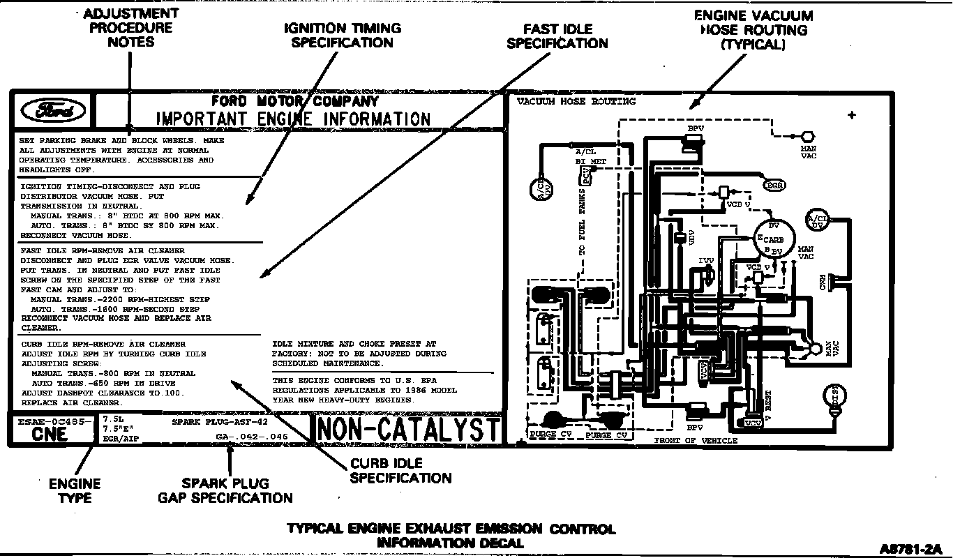 Maintenance service adjustments must conform to specifications contained in the Engine/Emissions Diagnosis* manual, to those listed in the Truck Performance Specifications Book or shown on the Vehicle Emission Control Information Decal which is located on or near the engine (Fig. 1), or the emissions systems may become inoperative.
