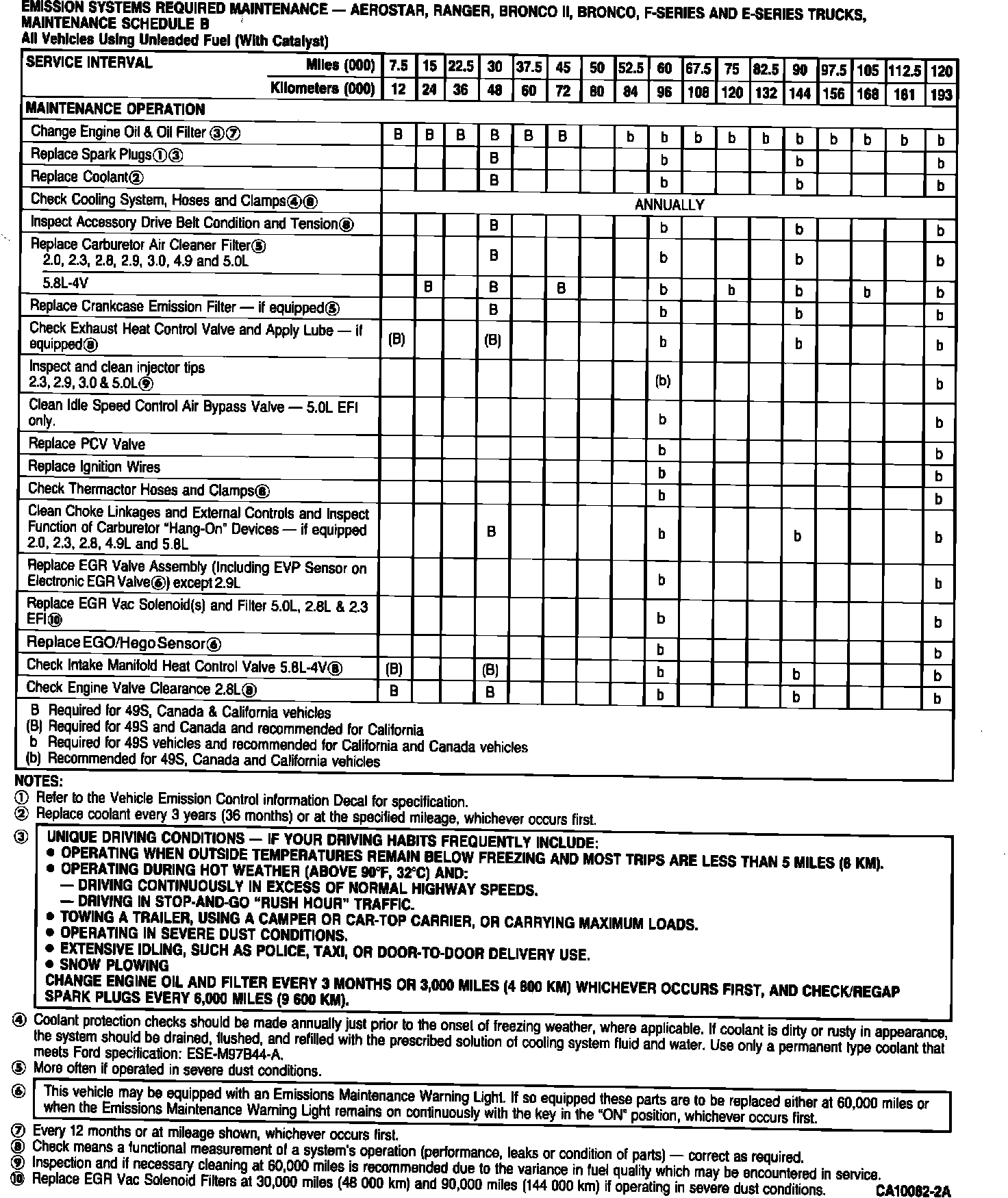 Maintenance Schedule Applicable To Bronco, E-150, E-250, E-350 and F-150, F-250, F-350 Trucks Four maintenance schedules are specified for the 1986 model Bronco, Econoline and F-Series trucks. They are identified by the lefters B, E, F and L. The application of the various maintenance schedules are as follows: