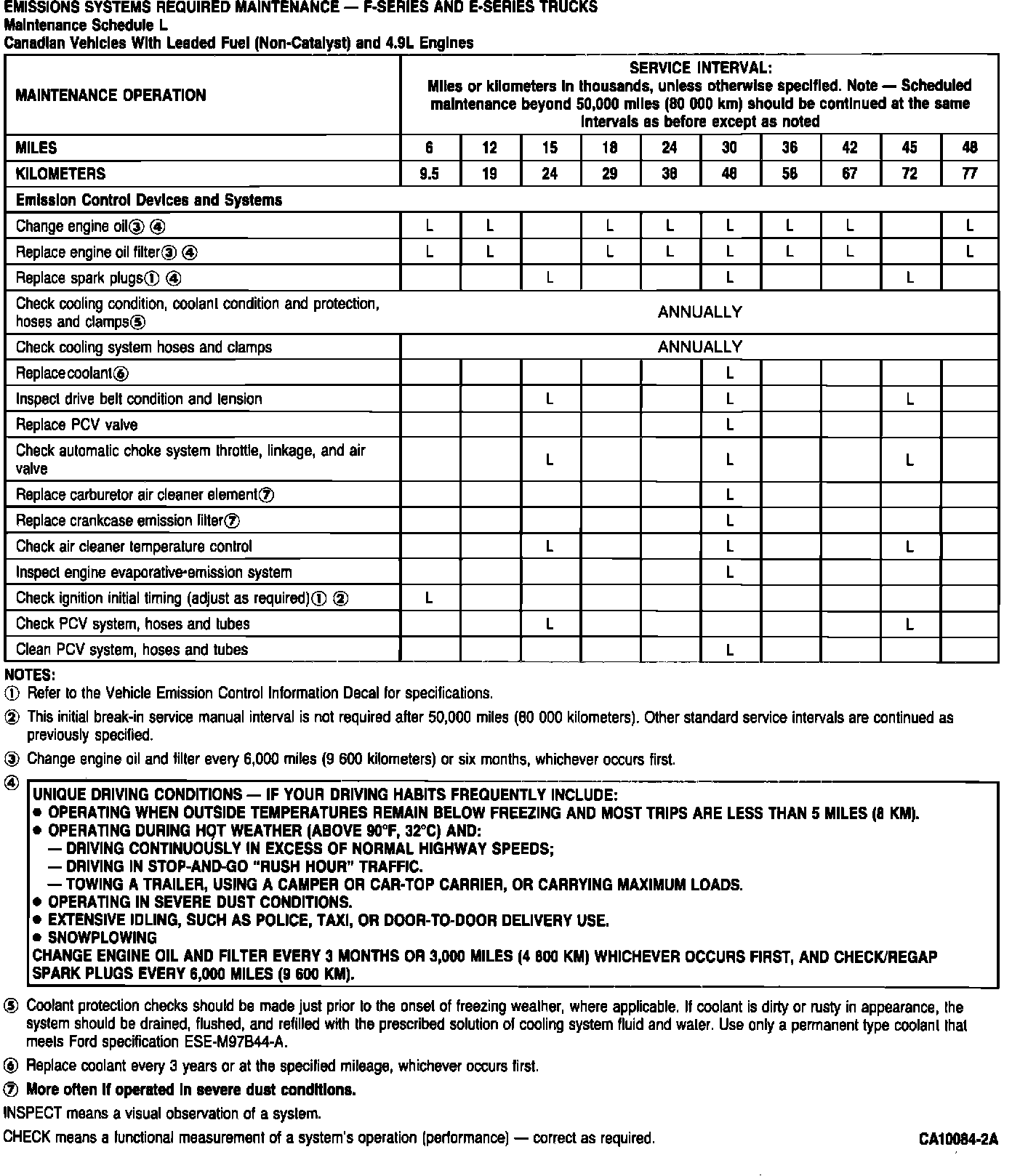 Maintenance Schedule "L" - Gasoline Engine Equipped Vehicles (Over/Under 8500 Pounds GVW) The "L" maintenance schedule is used for the following non-catalyst "Canadian only" leaded fuel vehicles built with 4.9L (300 CID) engines.