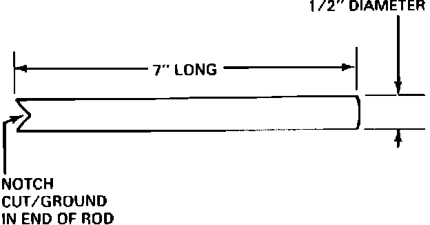 The caliper pin removal tool is recommended for use on all the above listed vehicles, including 1988 Super Duty, Figures 8 through 11. This caliper pin tool can be made from a 1/2 inch diameter rod 7 inches long. Simply grind or "V" notch in one (1) end. The "V" notch is used to compress the pin retention tabs while the tool is also used to drive the pin out of the caliper slide groove. This tool replaces a pair of pliers and screwdriver as outlined in the Shop Manual service procedure.