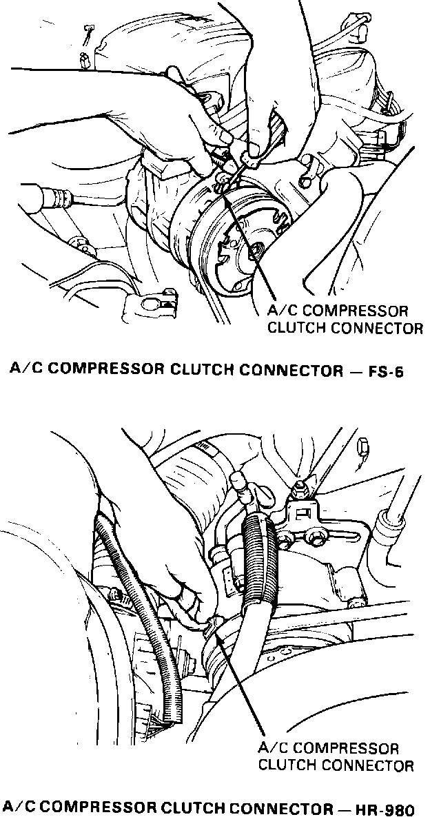 3. With vehicle engine turned off, disconnect the electrical connector at the A/C clutch. If electrical connector is hard to reach, disconnect pressure switch at suction/accumulator.