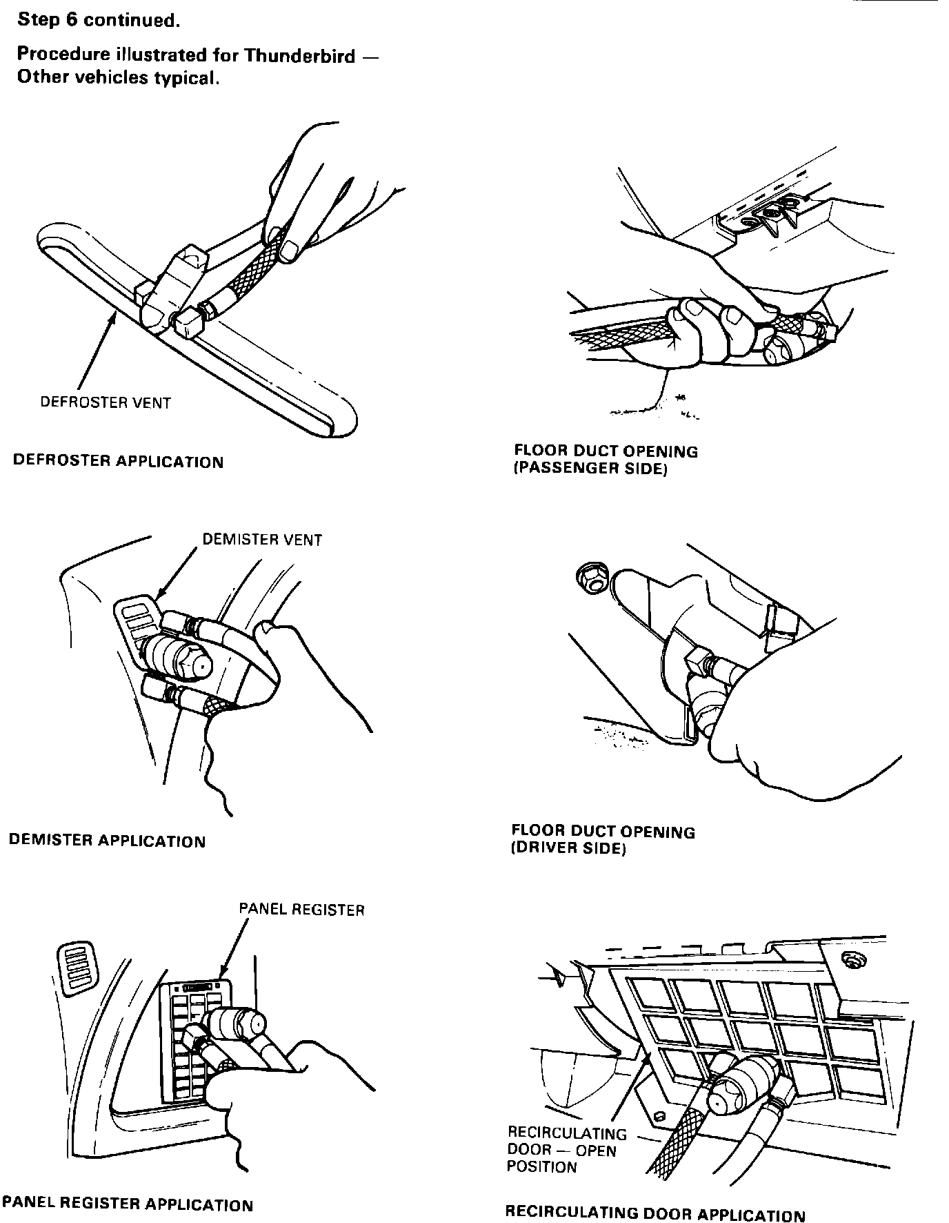 7. Restart engine and adjust temperature setting to 90~F. The airflow should be from floor duct outlets. Turn ignition off. Spray as in Step 6.