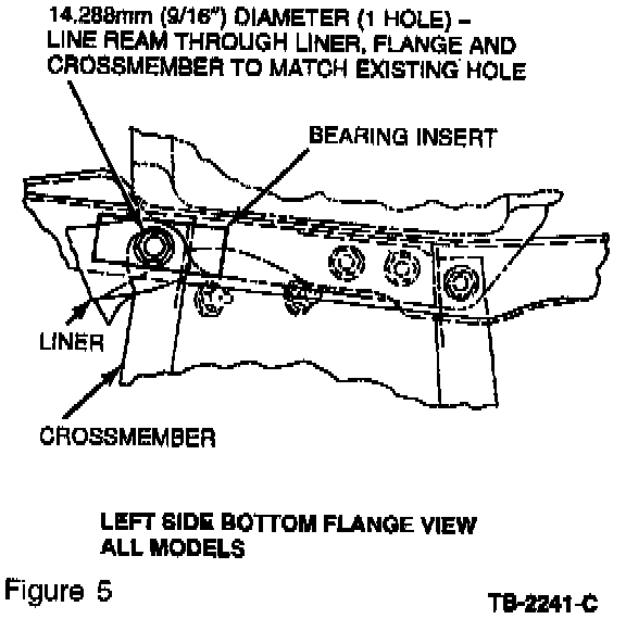 4. Line ream the existing hole through the liner, frame flange and crossmember to 14.288 mm (9/16") (Figure 5). Remove any burrs after reaming.