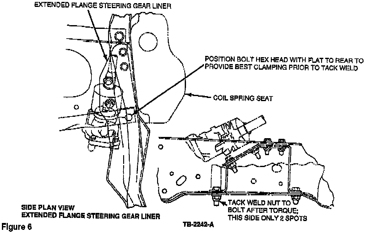 b. Install the washer and nut and torque nut to 190 14 Nm (140 13 lb-ft). Turn the wheels lock-to-lock several times to seat the joint and retorque. Tack weld the nut to the bolt after tightening.
