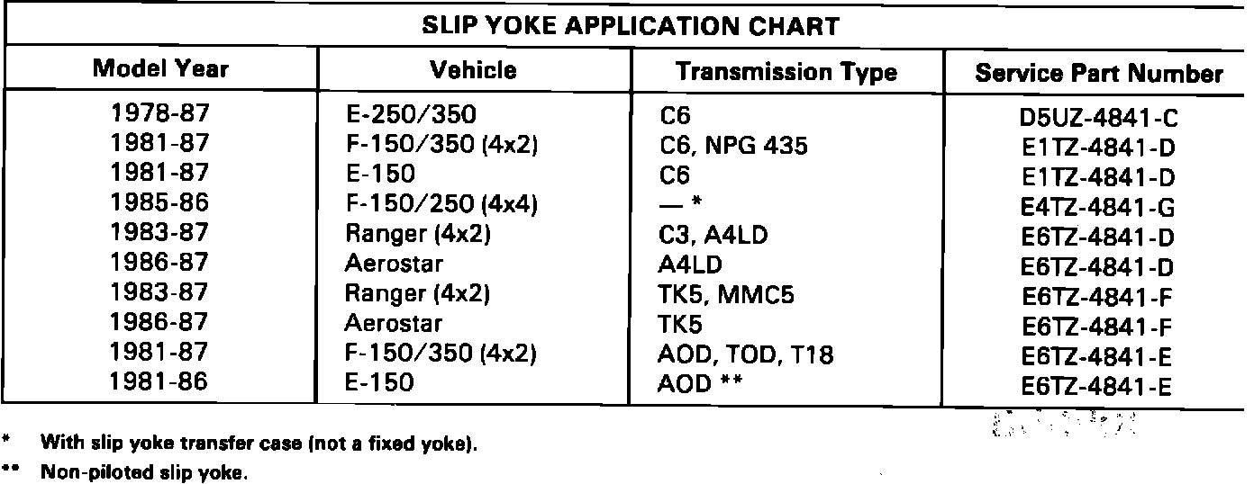 A "clunk" or "grunt" noise from the vehicle driveline during start-up and stopping drive modes may be caused by engine torque preventing the slip yoke from sliding smoothly on the transmission output shaft splines. During the same drive modes, rear suspension wrap-up overcomes slip yoke-to-output shaft friction causing sudden slip yoke/driveshaft movement, which results in a "clunk" or "grunt" noise. The affected vehicles are 1978-87 E-250/350 with a C6 transmission; 1981-87 F-150/350 (4x2) with a C6, NPG 435, AOD, TOD, or T18 transmission; 1981-87 E-150 with a C6 or AOD transmission; 1985-86 F- 150/250 (4x4); 1983-87 Ranger (4x2) and 1986-87 Aerostar.