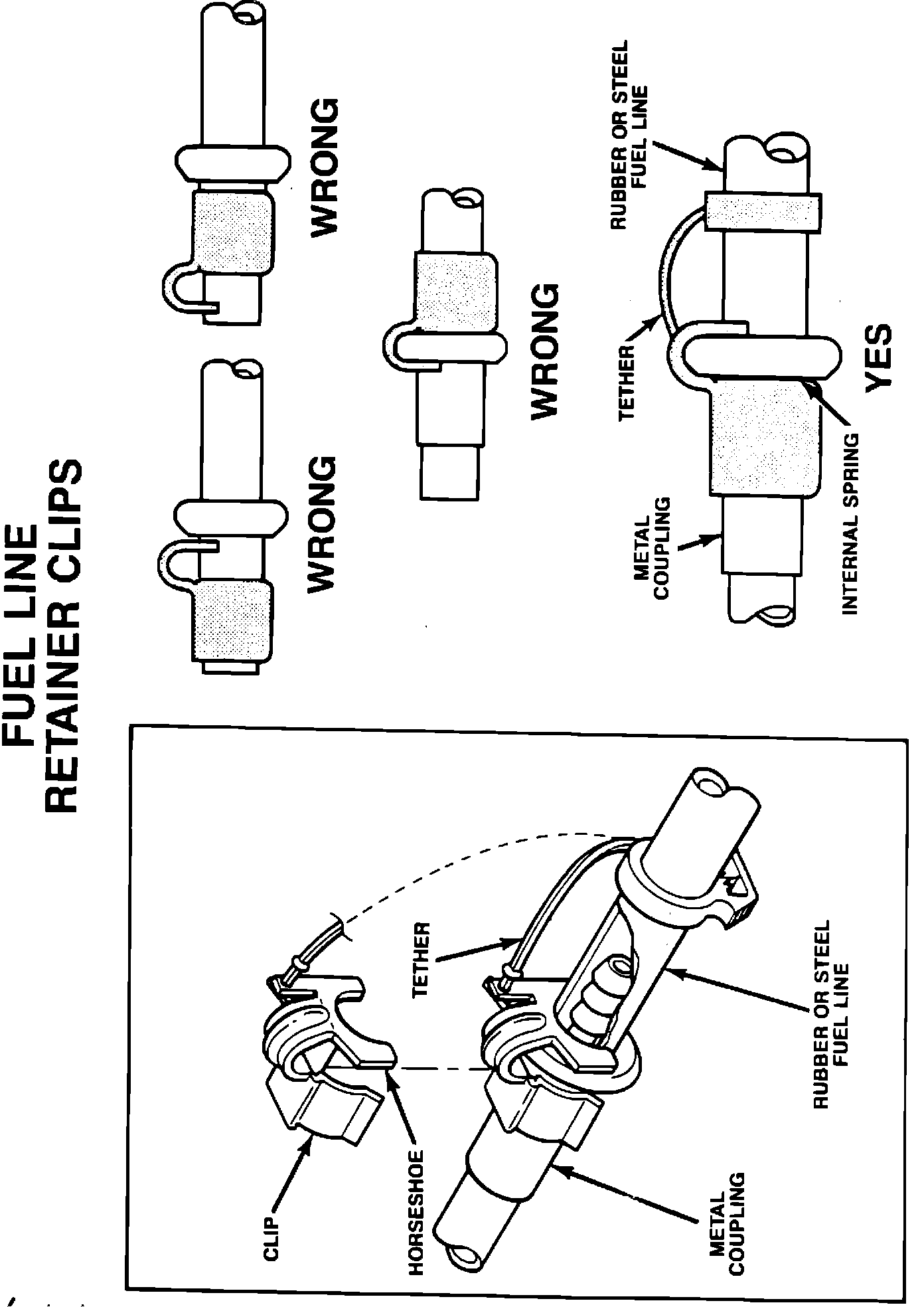 3. Firmly push retainer clip onto spring lock coupling, seating clip on metal portion and "horseshoe" over coupling. DO NOT INSTALL RETAINER CLIP OVER RUBBER FUEL LINE.