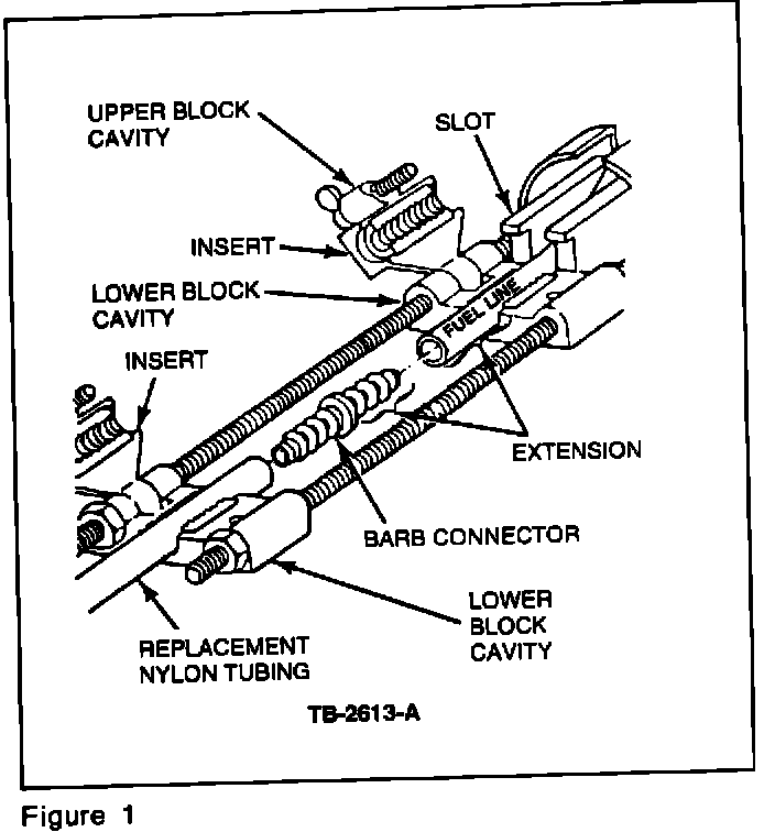 Metal fuel lines and connectors have been replaced with nylon lines and connectors on the subject vehicles. A procedure has been developed for servicing damaged nylon fuel lines.
