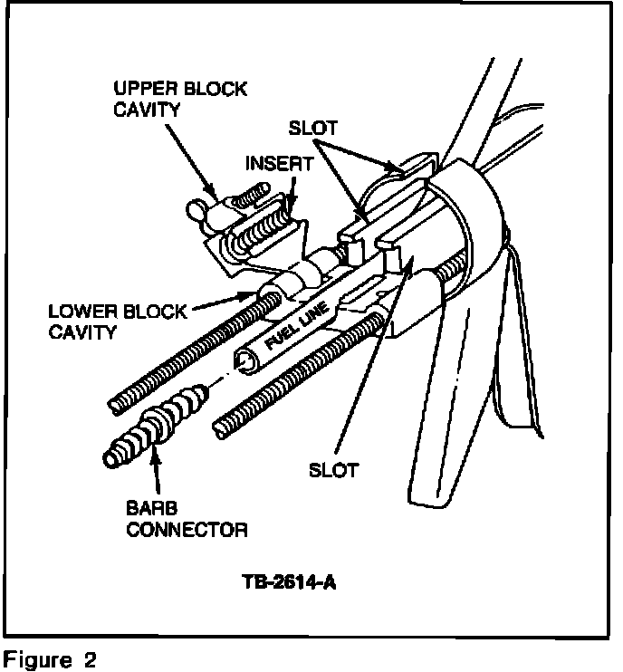a. Select the proper inserts for the fuel line size and install into both sets of upper and lower block cavities.