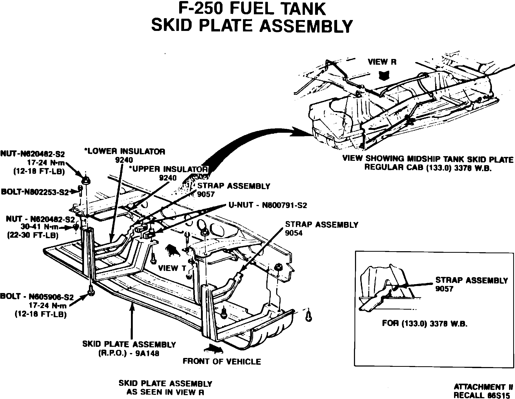 1. Position retaining straps (9054 and 9057) as shown in view "T" of Attachment II, then route straps around fuel tank/front shield assembly and secure assembly to the vehicle using attaching bolts and nuts. Tighten to 30-41 N-m (22-30 ft.lbs.).