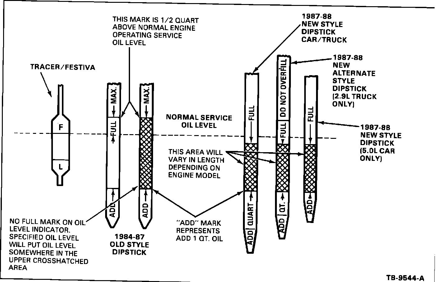 On "FULL/ADD", "FULL/ADD 1 QUART" or "F" style dipsticks the oil level of an engine filled with the correct amount of oil, as listed in the "Vehicle Oil Capacity Specification Chart" will normally occur slightly above the "FULL" line, Figure 6. This occurs because the "FULL" mark on the dipstick represents the lowest level of oil that could occur when an engine is filled with the specified volume of oil. This variation in oil level is due to manufacturing tolerances and oil level checking conditions.