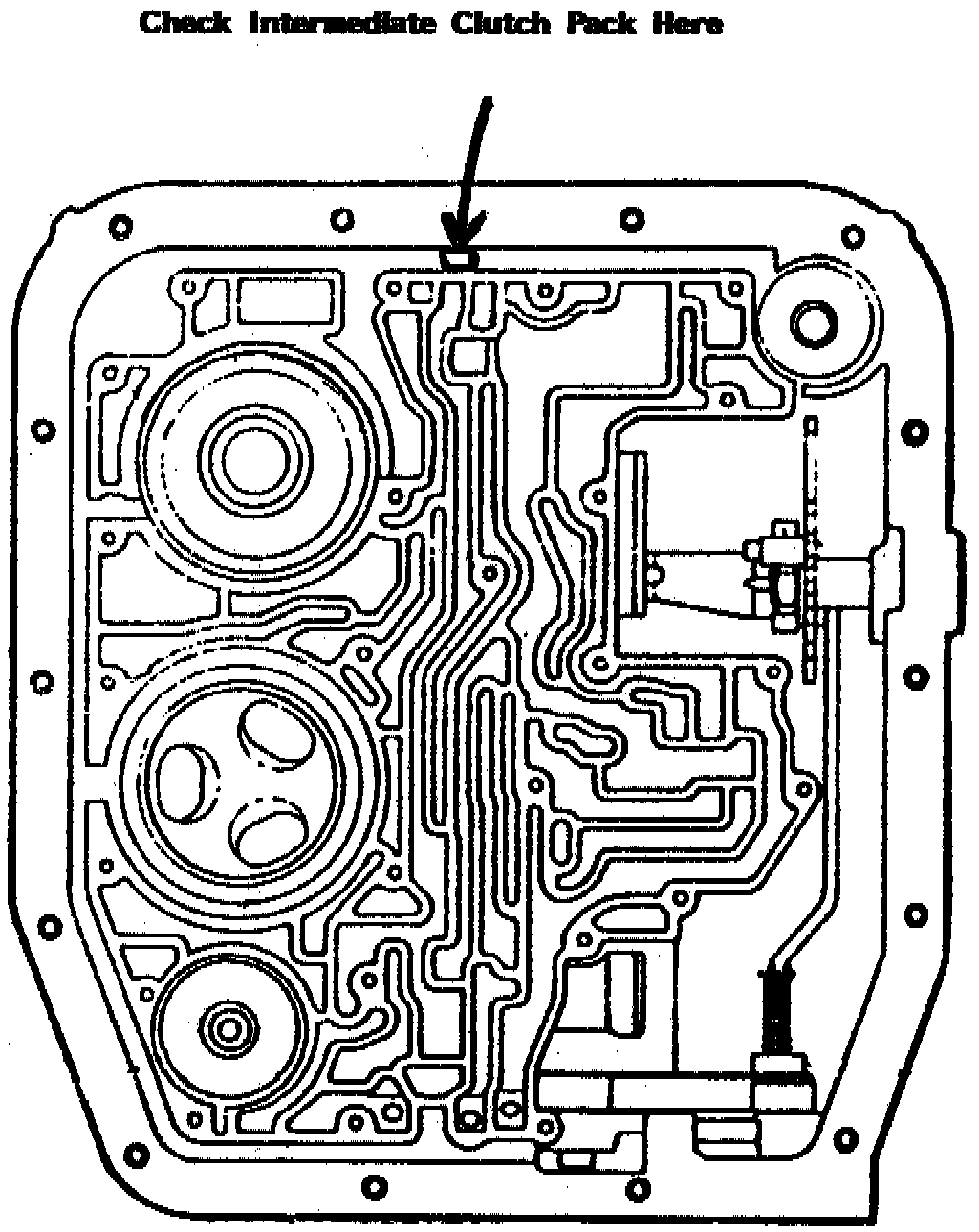 Intermediate clutch pack clearance can be checked with a tool, or through a small hole in the case after the front pump has been installed. (See Figure)