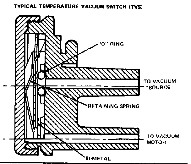 The bimetal disc in the switch orients itself in one of two positions, depending on its temperature. One position allows free air flow in the vacuum line; the other position blocks air flow by sealing itself against the 0-ring.