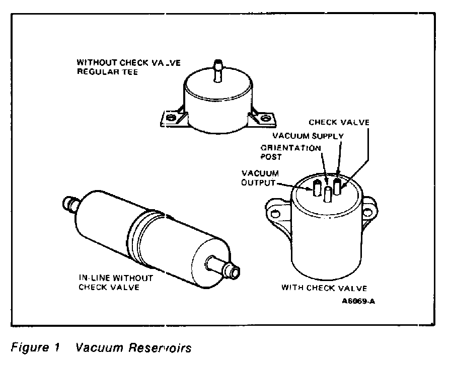 The Vacuum Reservoir, (Figure 1). stores vacuum and provides "muscle" vacuum. It prevents rapid fluctuations or sudden drops in a vacuum signal such as those seen during an acceleration period.