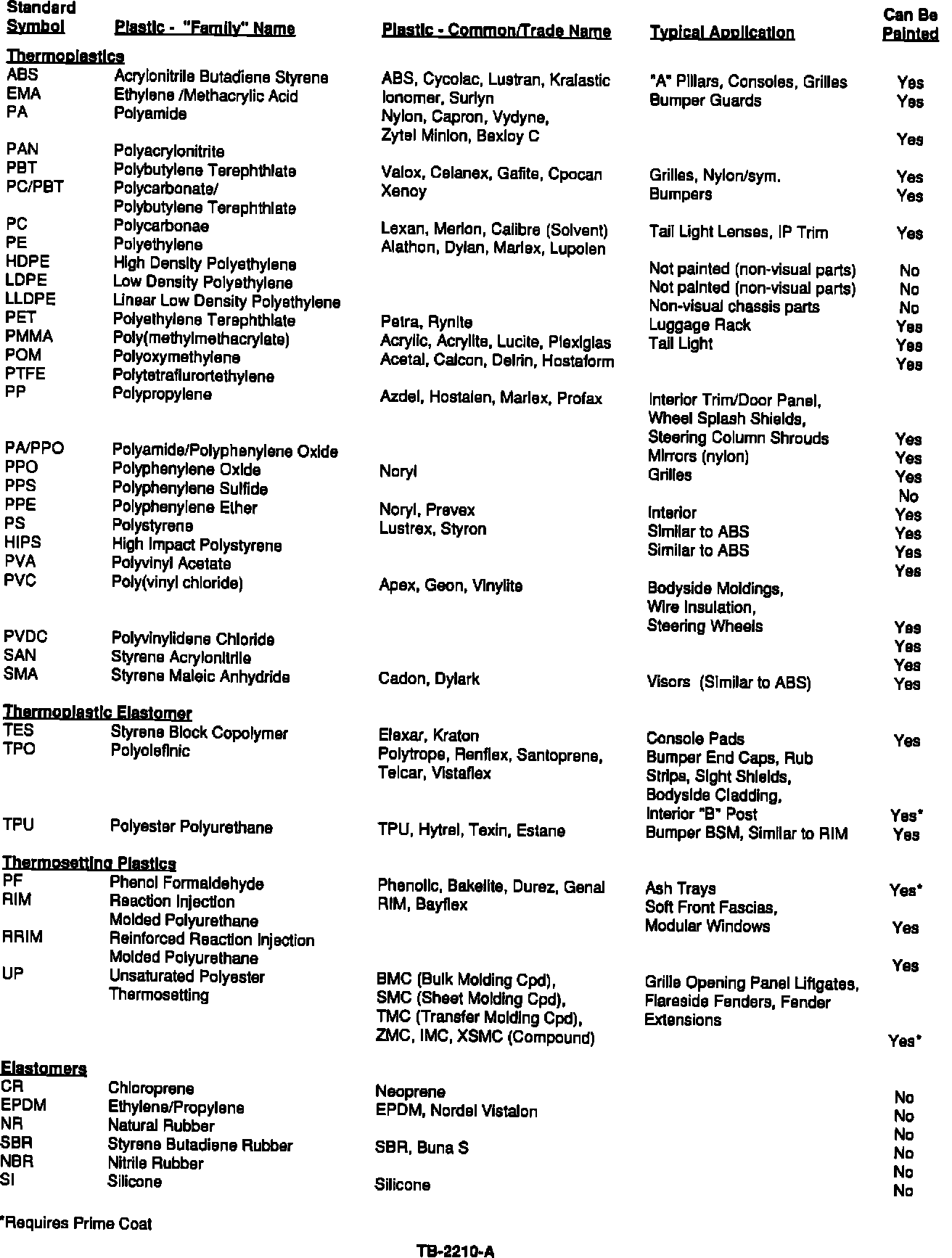 The Paintable Plastics Chart, Figure 6, is a summary of widely used plastics in our industry. The standard symbol should be located on the part for ease of material identification.