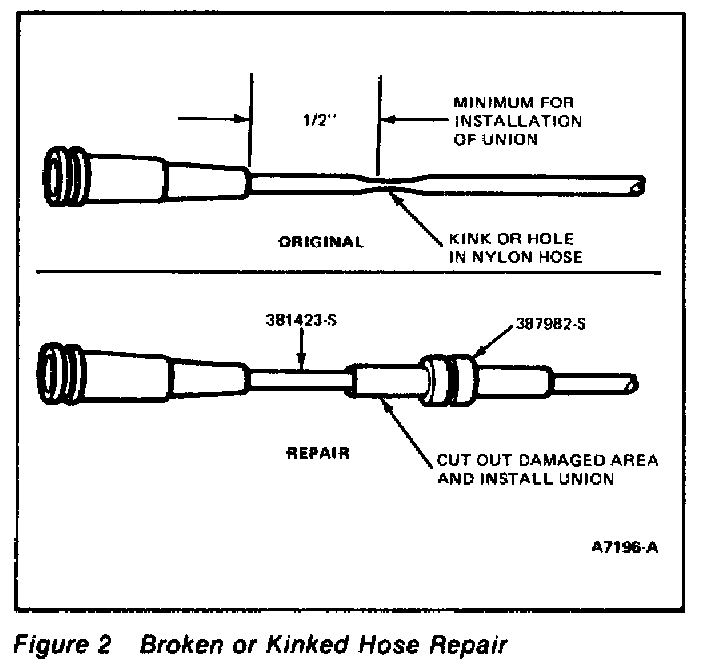 If a nylon tube is broken or kinked, and the damaged area is 1/2-inch or more from a connector; the tube can be repaired by cutting out the damaged section, but not more than 1/2-inch, and then installing a rubber union, Figure 2.