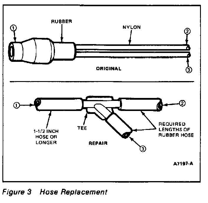 If the remaining hose is too short or the damaged portion is more than 1/2-inch: replace the entire hose and connectors with rubber vacuum hoses and a tee. Use existing service stock of 5/32-inch hose, 7/32-inch hose and tees.