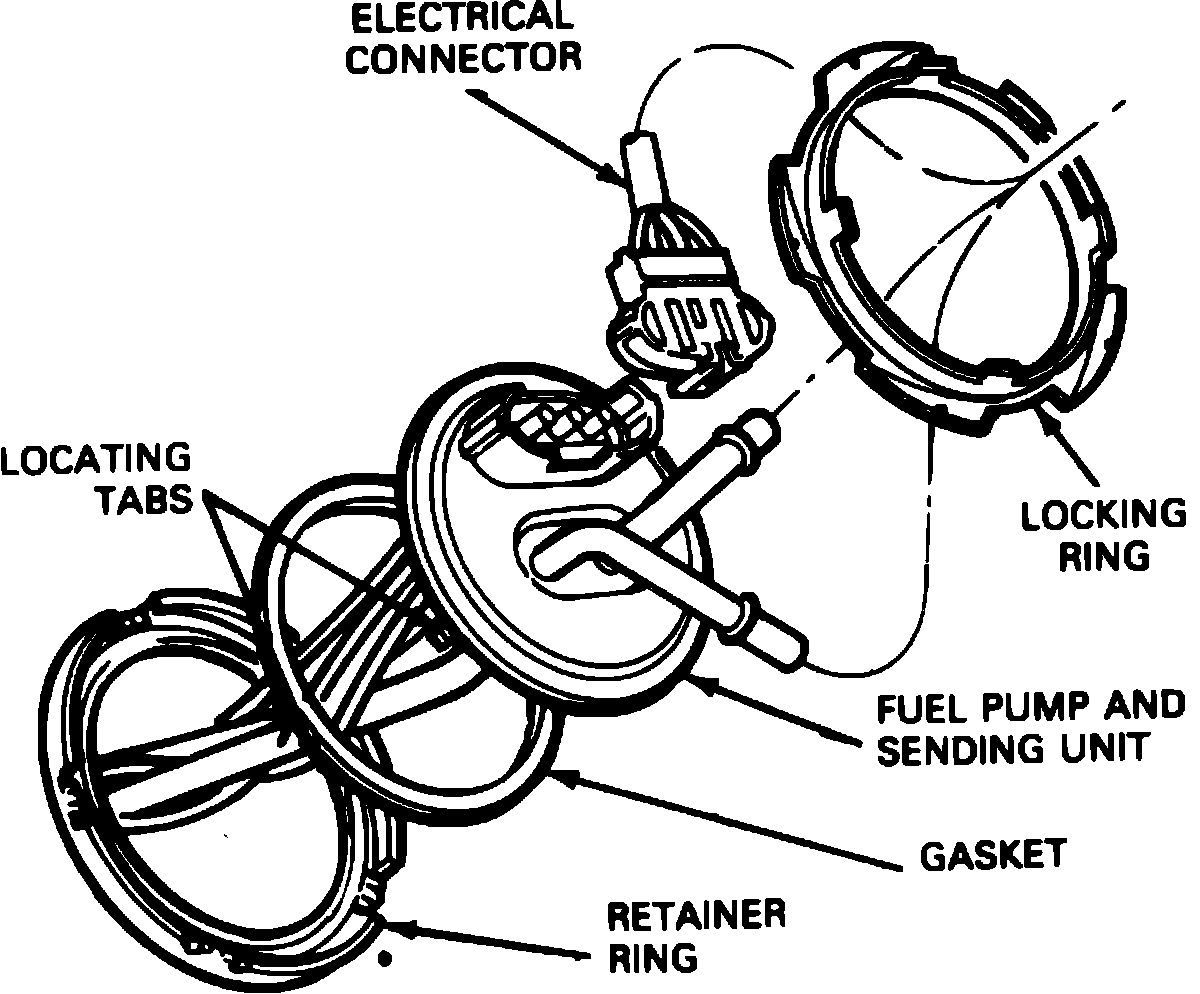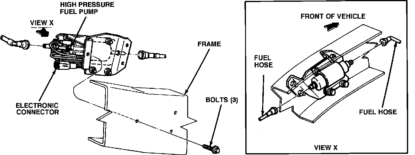 The electric fuel pump system consists of two fuel pumps: a low pressure boost pump mounted in the fuel tank, and a high pressure fuel pump mounted on the frame rail. The low pressure pump is located with its inlets at the bottom of an internal sump in the fuel tank. This design provides for satisfactory fuel pump operation during extreme vehicle maneuvers and steep vehicle attitudes with low tank fill levels.