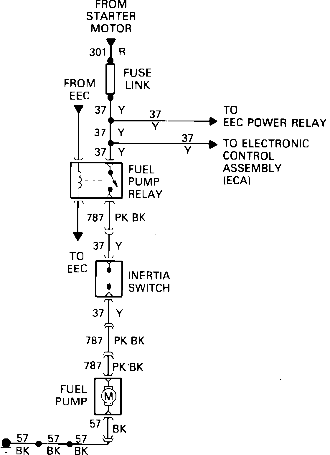Fig. 7 Fuel pump wiring diagram. 1985 - 87 4-140 EFI except Aerostar & V8-302, Early 1986 Aerostar 4-140 EFI, 1986-87 V6-177 & 1987 6-300 models w/single fuel tanks: