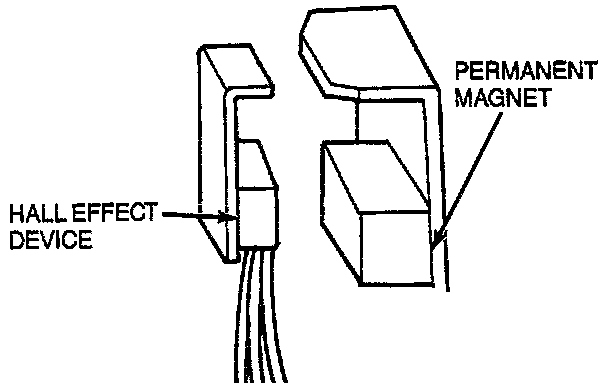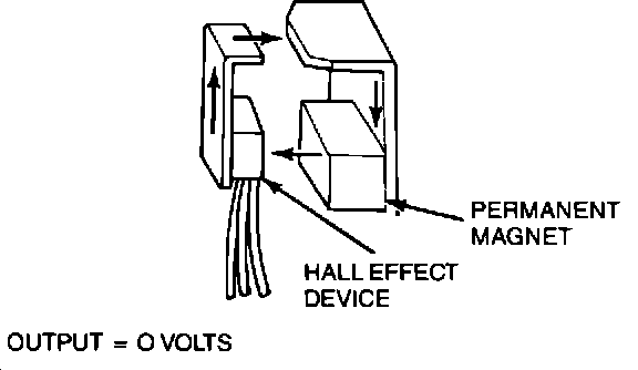 When the window of the vane cup is between the magnet and the Hall Effect device, a magnetic field is completed from the magnet through the Hall Effect device and back to the magnet.