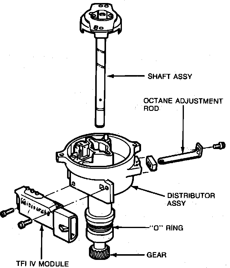 As the vane passes through this opening, the flux lines are shunted through the vane and back to the magnet. At this time, a voltage is produced as the vane passes through the opening. When the vane clears the opening, the window edge causes the signal to go to zero volts. The signal is then used by the EEC system for Crankshaft position Sensing and the Desired Spark Advance based on engine demand and calibration. The spark advance and voltage distribution is accomplished through a conventional rotor, cap and ignition wires.