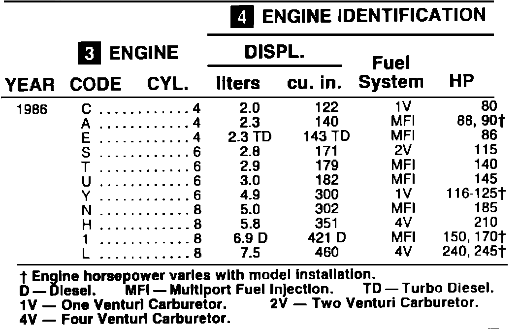 (4) ENGINE IDENTIFICATION: On the line where the engine code appears, read to the right to identify the engine.