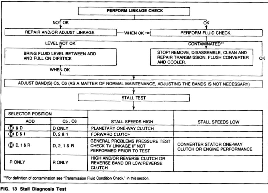 The stall test checks converter clutch operation and installation, the holding ability of the forward clutch, reverse clutch, the low-reverse bands, the planetary one-way clutch and engine performance.