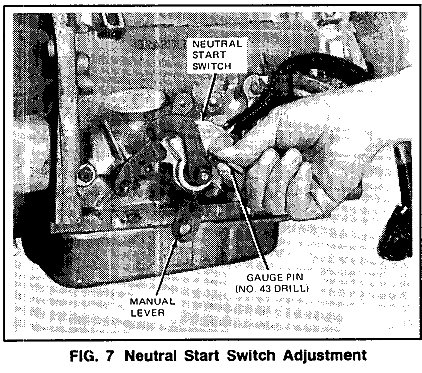 3. Place the transmission manual lever in NEUTRAL. Rotate the switch and insert the gauge pin (No.43 drill shank end) into the gauge pin holes of the switch. The gauge pin has to be inserted a full 12.303 mm 31/64 inch into the three holes of the switch (Fig. 7).
