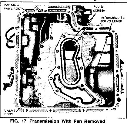 3. Remove the transmission pan attaching bolts from both sides and the rear to allow the fluid to drain further. Finally, remove the remainder of the attaching bolts. Remove the pan and gasket. Remove and discard the nylon shipping plug from the pan. This plug is used to retain transmission fluid within the transmission during shipment and should be discarded when the oil pan is removed.