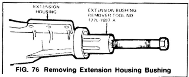 3. Remove the bushing as shown (Fig. 76). Use the bushing remover Tool T77L-7697-A or equivalent carefully so that the output shaft spline is not damaged.