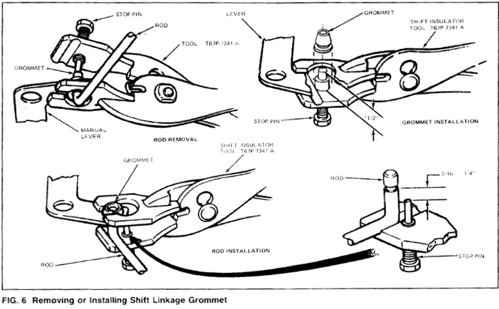 1. Place the lower jaw of the Shift Linkage Installation Tool, T67P-7341-A between the lever and the rod Fig 6). For areas with limited space, use Shift Linkage Grommet Remover, T84P-7341-A for removal of the grommet (Fig. 7). Position the stop pin against the end of the control rod (Fig. 6) and force the rod out of the grommet. Remove the grommet from the lever by cutting off the large shoulder with a sharp knife. The grommet must be removed from the lever and a new one installed each time the rod is disconnected.