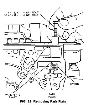1. Remove the bolts securing the parking pawl guide plate to the case (Fig. 32). Remove the plate.