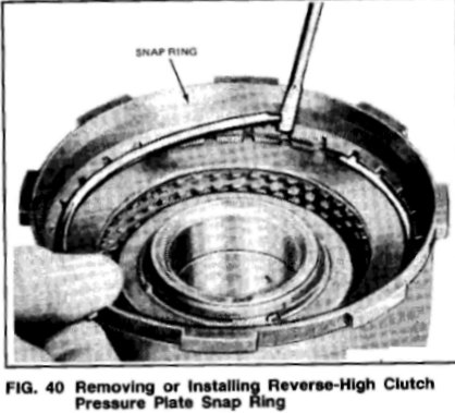 1. Separate the drive train as shown in Fig. 39. Remove the pressure plate snap ring as shown in Fig. 40.