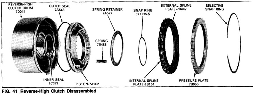 6. Clutch plate usage varies with each model, refer to the specification for the number of plates required.Specifications Dip the clutch plates in clean transmission fluid. Install the clutch plates alternately starting with a steel drive (internal) plate (Fig. 41). When new composition clutch plates are used, soak the plates in automatic transmission fluid, (Spec. ESP-M2C116-H) or equivalent, for 15 minutes before they are assembled.