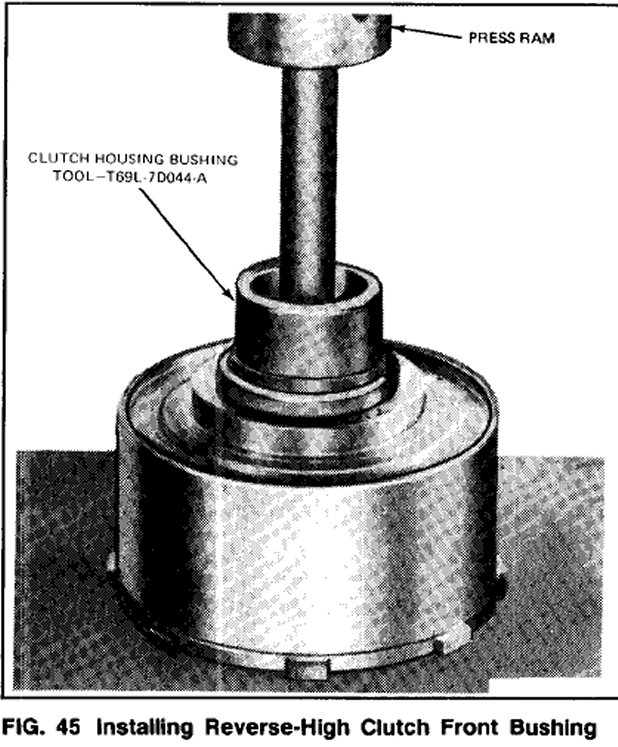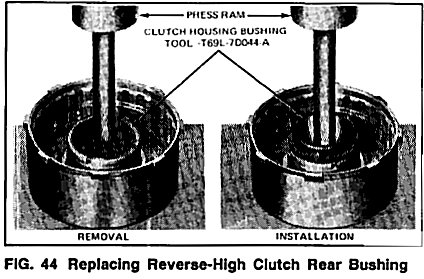 1. If the clutch drum bushings was removed, position the drum a press and press new bushings into the drum with the Tool T69L-7DO44-A shown in Figs. 44 and 45.