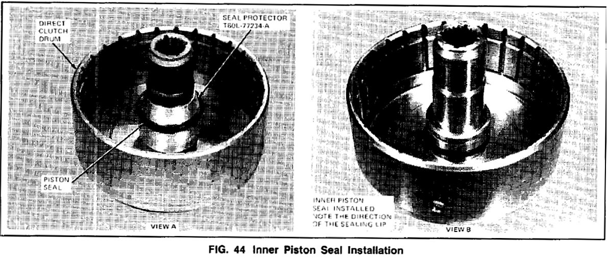 a. Position Seal Protector T8OL-77234-A over the clutch drum hub (View A, Fig. 44).