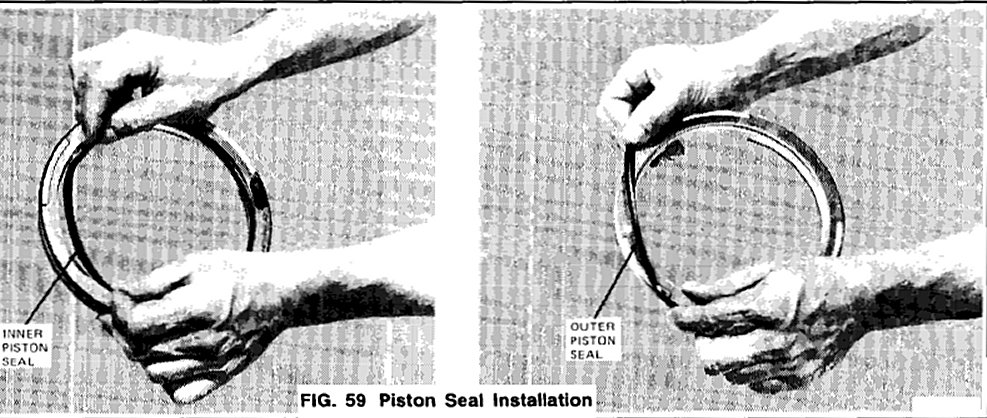 4. Install new seals on the clutch piston. Note the direction of the sealing lip before installation. The lips point away from the spring posts (Fig. 59).