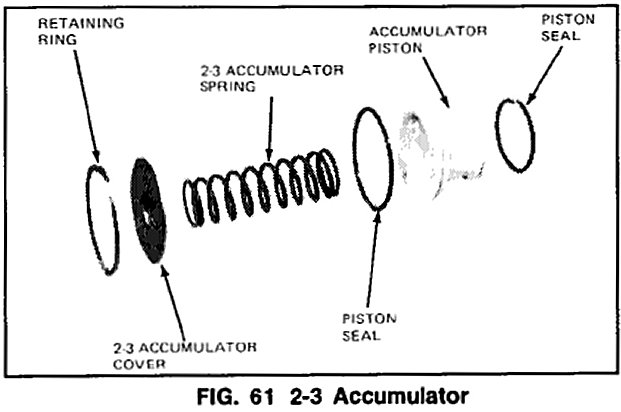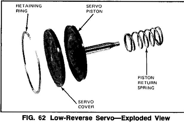NOTE: Some transmissions will be built without a spring. Also~ the piston and spring construction may be different from that shown. Be sure the diagonal cuts on the piston seal are aligned properly.
