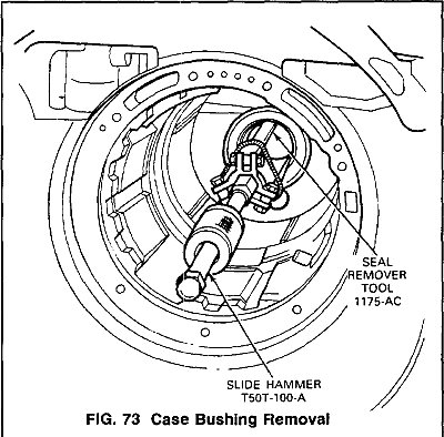 To remove the transmission case bushing use Slide Hammer T5OT-1OO-A and Seal Remover TOOL 1175AC (Fig 73).