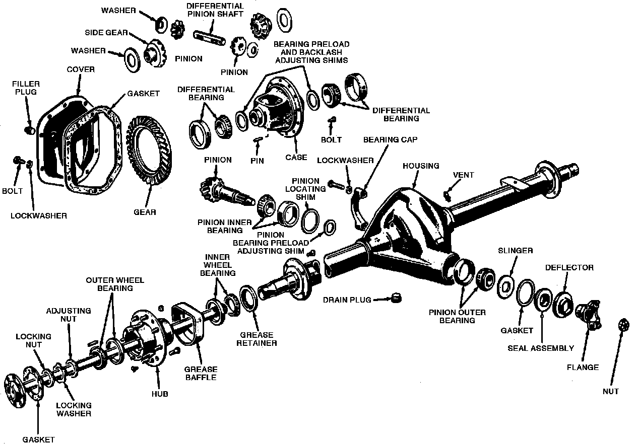 This rear axle, Fig. 1, is a semi-floating type, while the axle shown in Fig. 2 is of the full-floating type. The drive pinion of either axle is of the over-hung design, mounted on preloaded tapered roller bearings. Sealing of the pinion shaft is accomplished by a spring-loaded seal on the companion flange. The flange is splined and secured to the pinion shaft by a nut.