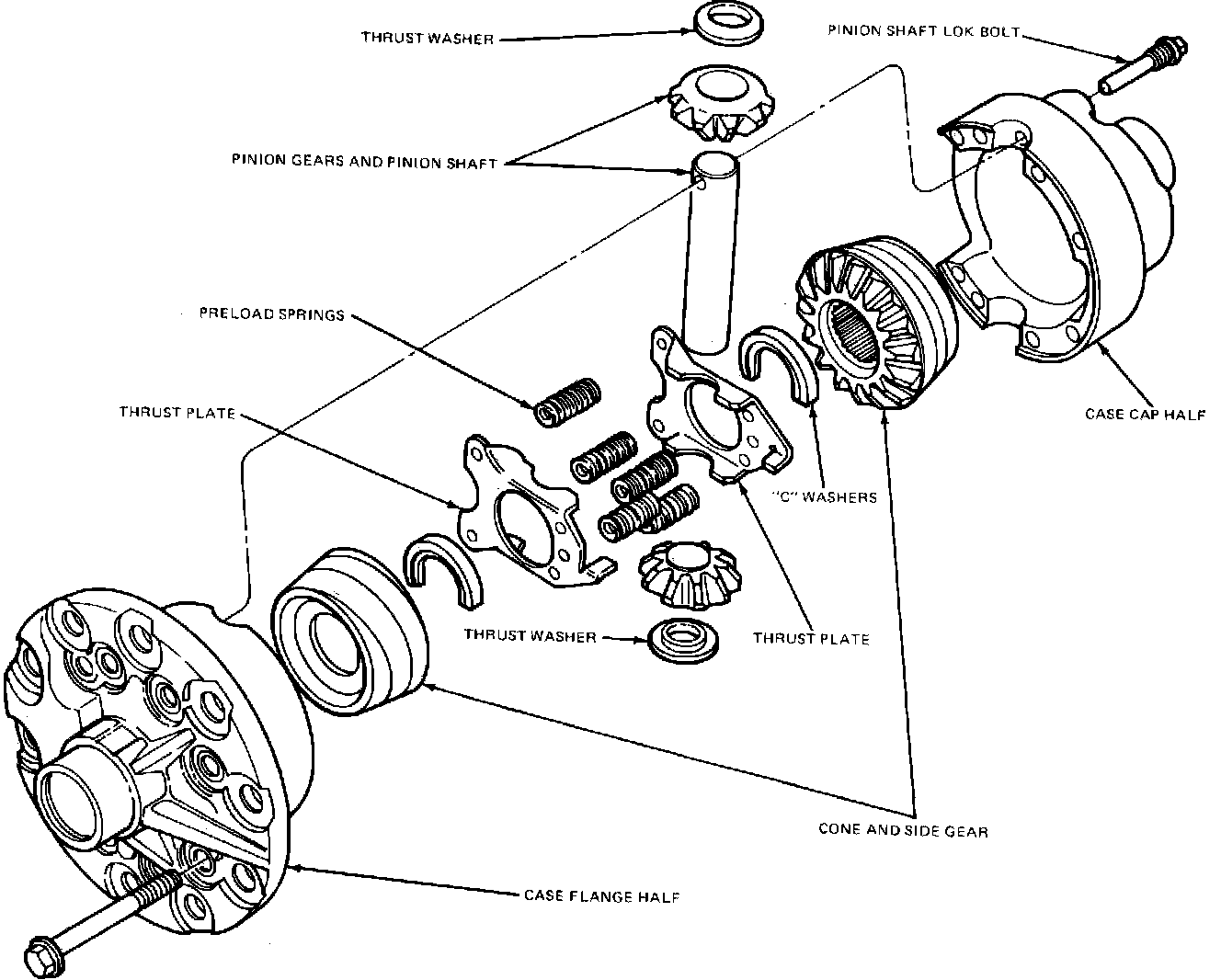 4. Remove side gear and brake cone assemblies, thrust plates, preload springs, pinion shaft, pinion gears and thrust washers. Note which cone comes from which half of case for proper assembly.