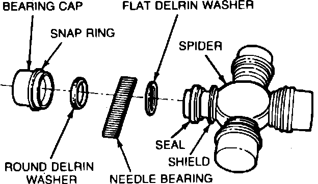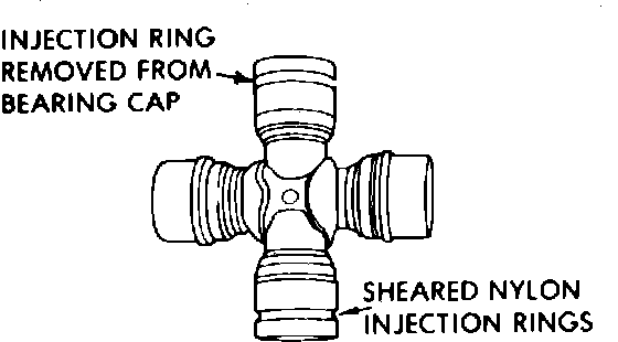 When universal joints are disassembled for lubrication or inspection, and the old parts are to be reinstalled, special care must be exercised to avoid damage to universal joint spider or cross and bearing cups. Some driveshafts use an injected nylon retainer on the universal joint bearings. When service is necessary, pressing the bearings out will sheer the nylon retainer, Fig. 1. Replacement with the conventional steel snap ring type is then necessary, Fig. 2.